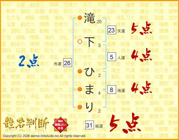 滝(20画)下(3画) ひ(2画)ま(4画)り(2画)