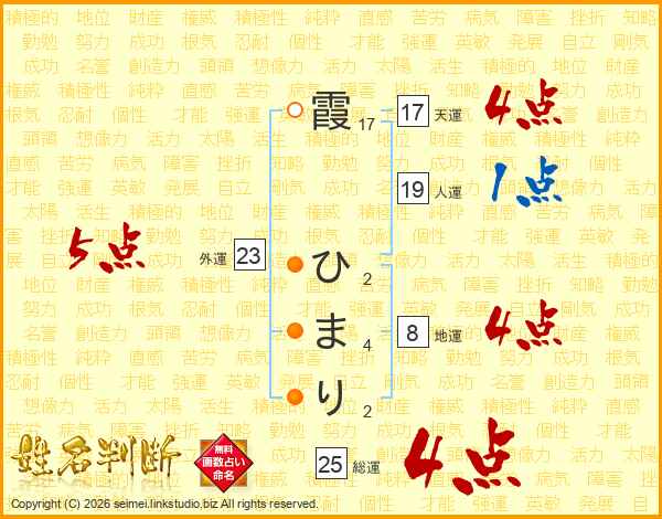 霞(17画) ひ(2画)ま(4画)り(2画)