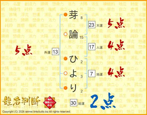 芽(8画)論(15画) ひ(2画)よ(3画)り(2画)