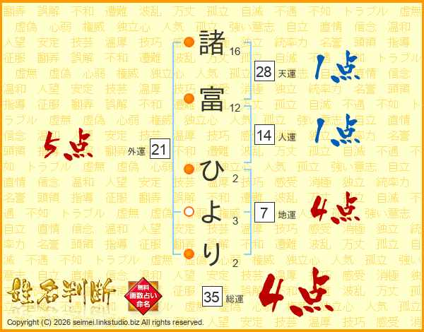 諸(16画)富(12画) ひ(2画)よ(3画)り(2画)