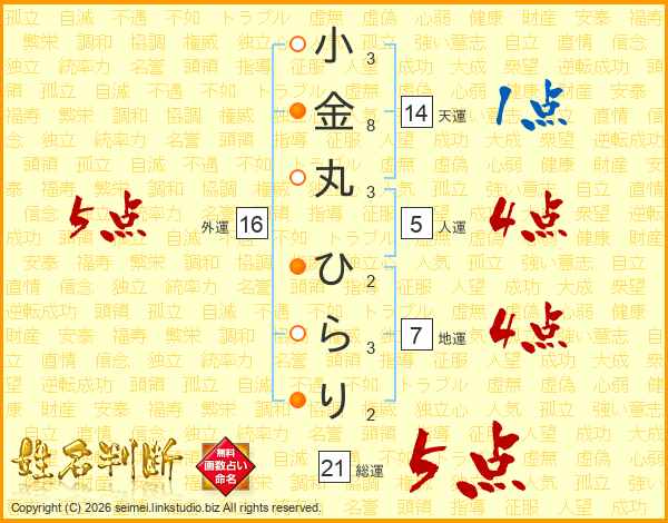 小(3画)金(8画)丸(3画) ひ(2画)ら(3画)り(2画)