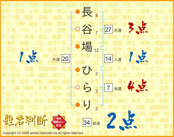 生活面を象徴する運勢です。外部から受ける影響力を表し、結婚運、家庭運や職場、環境への順応性を表します。総運から人運を引いた画数。姓や名が1文字の場合を除く。