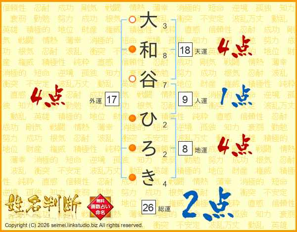大和谷ひろきさんの総運は26画の2点!