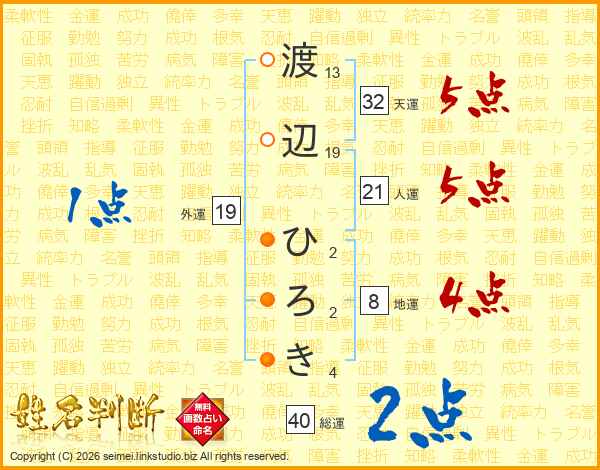渡(13画)辺(19画) ひ(2画)ろ(2画)き(4画)
