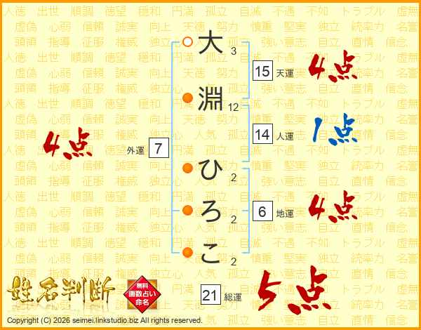 生活面を象徴する運勢です。外部から受ける影響力を表し、結婚運、家庭運や職場、環境への順応性を表します。総運から人運を引いた画数。姓や名が1文字の場合を除く。