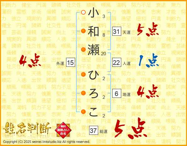 小和瀬ひろこさんの総運は37画の5点!