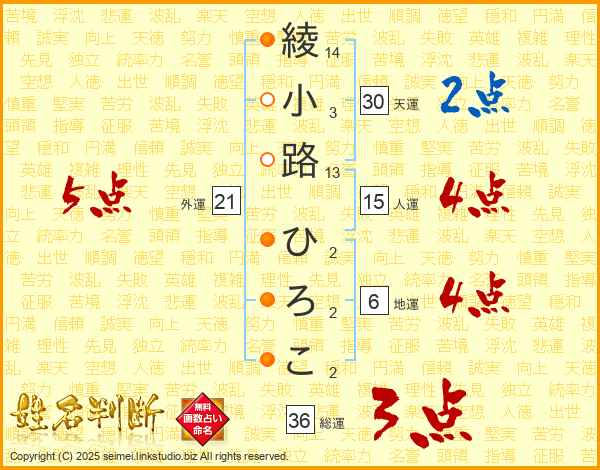 綾(14画)小(3画)路(13画) ひ(2画)ろ(2画)こ(2画)