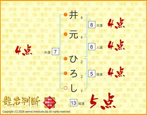 井元ひろしさんの総運は13画の5点!