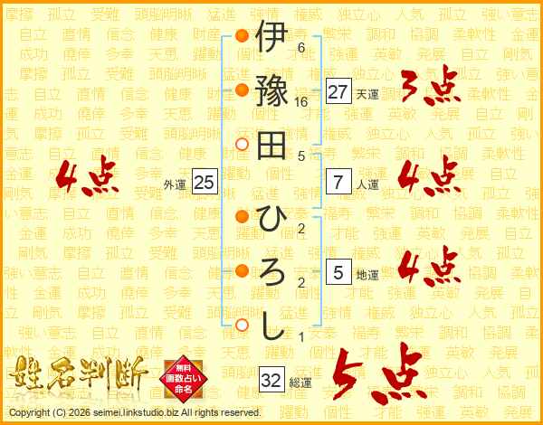 伊豫田ひろしさんの総運は32画の5点!