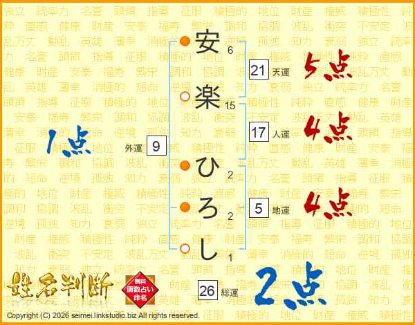 安楽ひろしさんの総運は26画の2点!