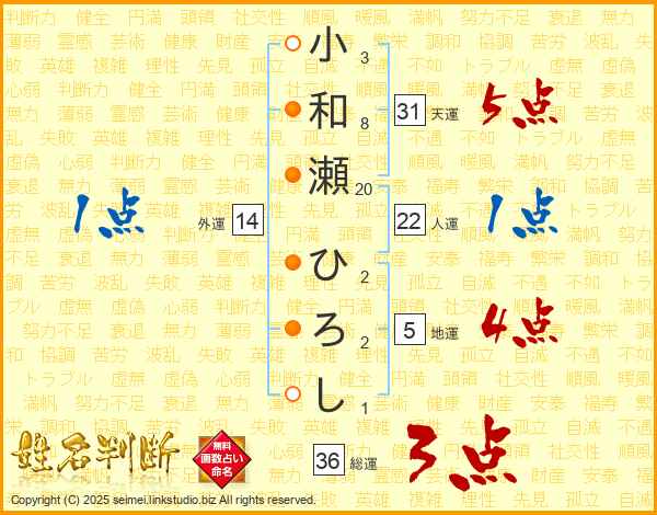 生活面を象徴する運勢です。外部から受ける影響力を表し、結婚運、家庭運や職場、環境への順応性を表します。総運から人運を引いた画数。姓や名が1文字の場合を除く。