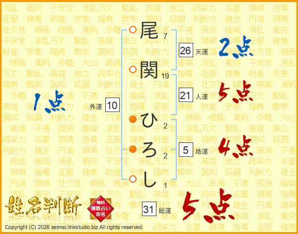 尾関ひろしさんの天運は26画の2点!
