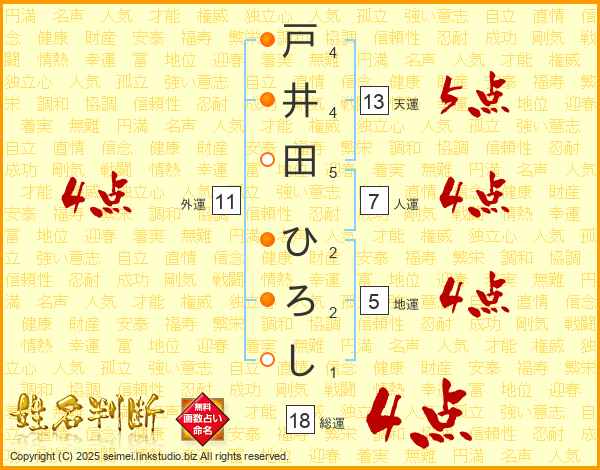 あなたの人生を表す1番重要な運勢です。生涯を通じて影響する総合運となり、主に50歳以降の晩年期に影響を及ぼします。苗字と名前の合計画数。