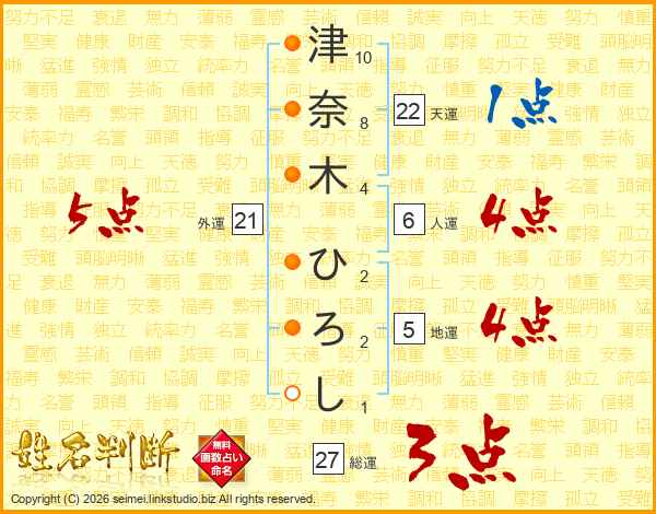 津(10画)奈(8画)木(4画) ひ(2画)ろ(2画)し(1画)