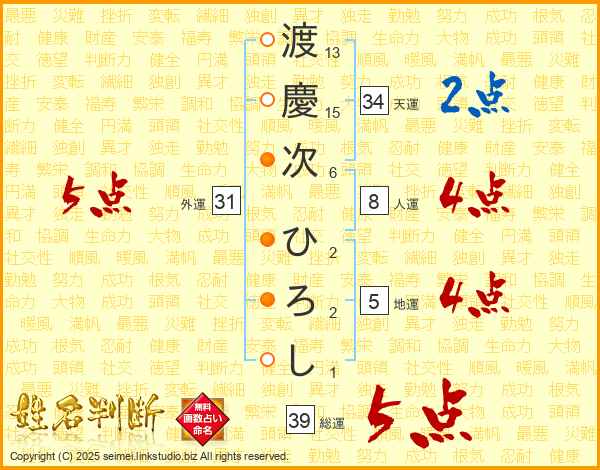 渡慶次ひろしさんの総運は39画の5点!