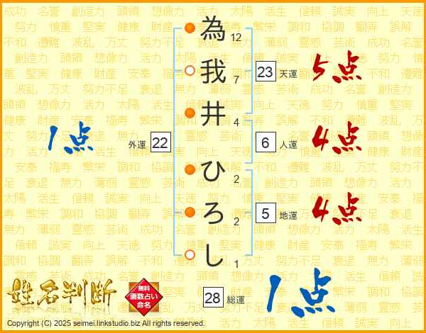 生活面を象徴する運勢です。外部から受ける影響力を表し、結婚運、家庭運や職場、環境への順応性を表します。総運から人運を引いた画数。姓や名が1文字の場合を除く。