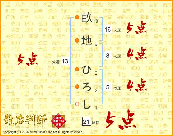 生活面を象徴する運勢です。外部から受ける影響力を表し、結婚運、家庭運や職場、環境への順応性を表します。総運から人運を引いた画数。姓や名が1文字の場合を除く。