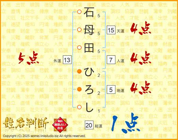 石(5画)母(5画)田(5画)  ひ(2画)ろ(2画)し(1画)