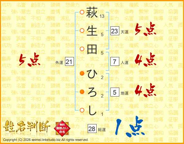 萩(13画)生(5画)田(5画) ひ(2画)ろ(2画)し(1画)