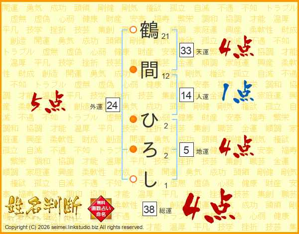 鶴(21画)間(12画) ひ(2画)ろ(2画)し(1画)