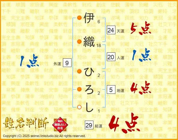 伊織ひろしさんの総運は29画の4点!