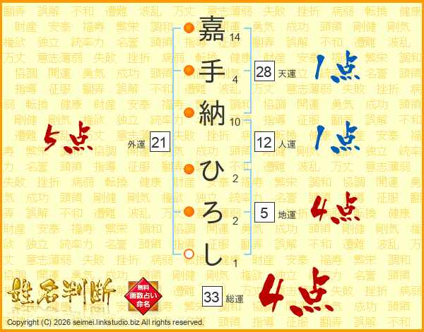 嘉(14画)手(4画)納(10画) ひ(2画)ろ(2画)し(1画)