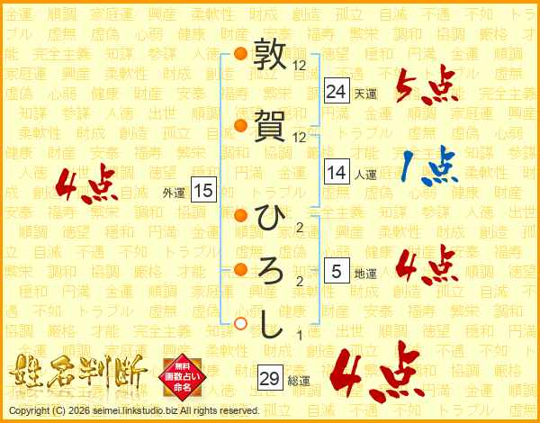 敦賀ひろしさんの総運は29画の4点!