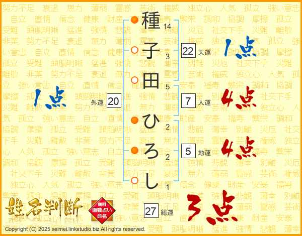 種子田ひろしさんの総運は27画の3点!