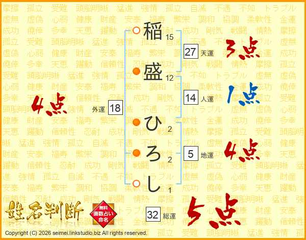 稲(15画)盛(12画) ひ(2画)ろ(2画)し(1画)