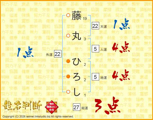 藤(19画)丸(3画) ひ(2画)ろ(2画)し(1画)