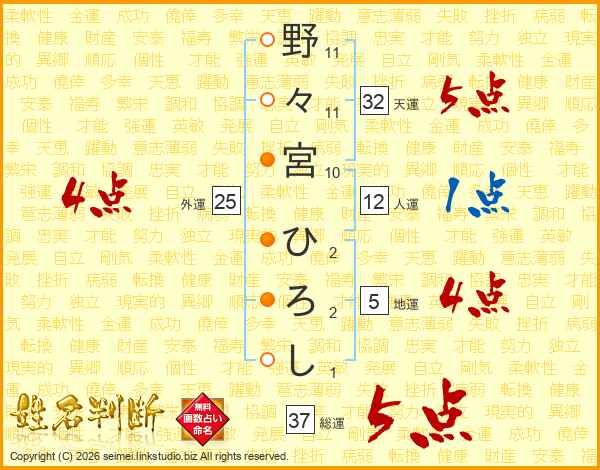 野々宮ひろしさんの総運は37画の5点!