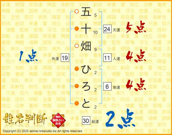 五十畑ひろとさんの総運は30画の2点!