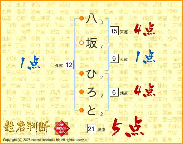 八坂ひろとさんの総運は21画の5点!