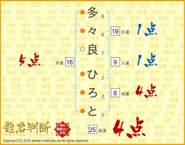 多々良ひろとさんの総運は25画の4点!