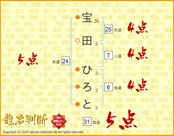 宝(20画)田(5画) ひ(2画)ろ(2画)と(2画)