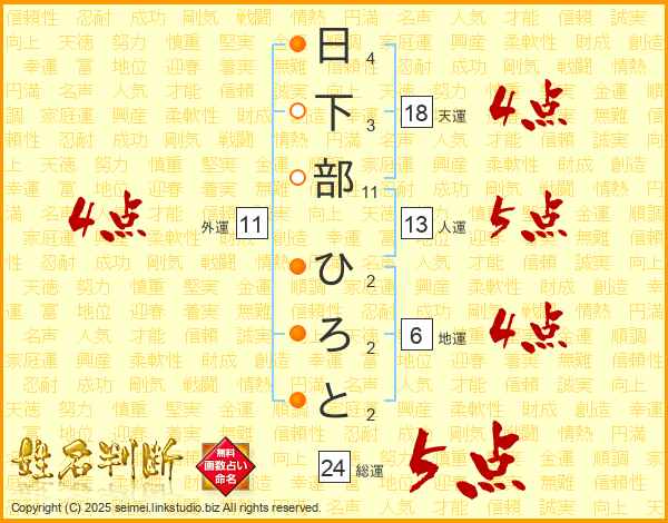 生活面を象徴する運勢です。外部から受ける影響力を表し、結婚運、家庭運や職場、環境への順応性を表します。総運から人運を引いた画数。姓や名が1文字の場合を除く。