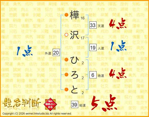 樺沢ひろとさんの天運は33画の4点!