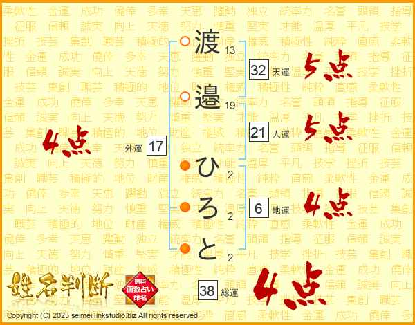 渡(13画)邉(19画) ひ(2画)ろ(2画)と(2画)