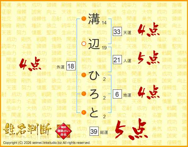 生活面を象徴する運勢です。外部から受ける影響力を表し、結婚運、家庭運や職場、環境への順応性を表します。総運から人運を引いた画数。姓や名が1文字の場合を除く。