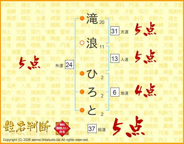 滝浪ひろとさんの総運は37画の5点!