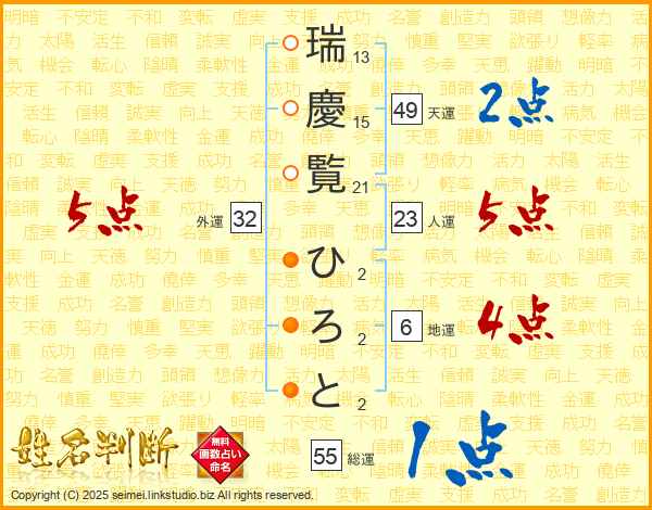 瑞(13画)慶(15画)覧(21画) ひ(2画)ろ(2画)と(2画)