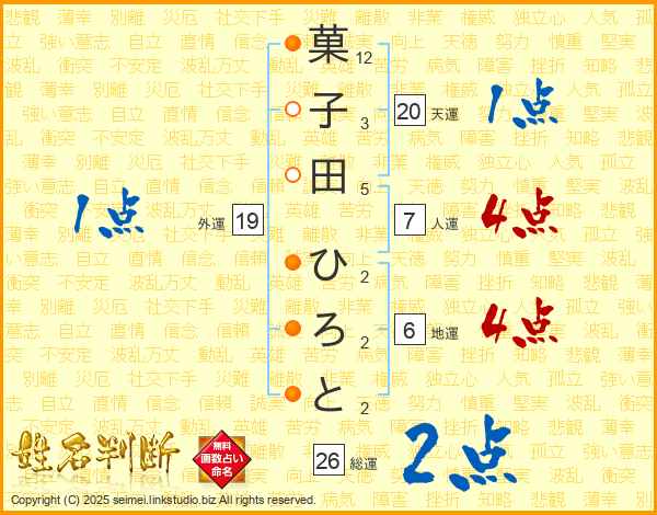 生活面を象徴する運勢です。外部から受ける影響力を表し、結婚運、家庭運や職場、環境への順応性を表します。総運から人運を引いた画数。姓や名が1文字の場合を除く。