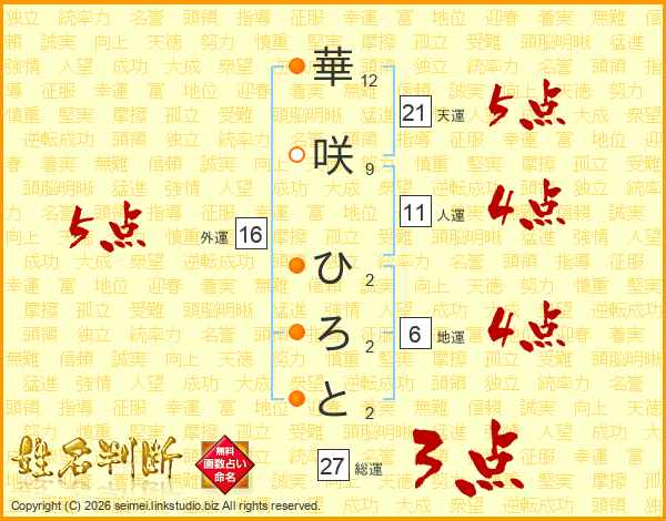華(12画)咲(9画) ひ(2画)ろ(2画)と(2画)