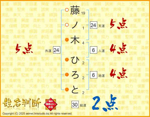 生活面を象徴する運勢です。外部から受ける影響力を表し、結婚運、家庭運や職場、環境への順応性を表します。総運から人運を引いた画数。姓や名が1文字の場合を除く。