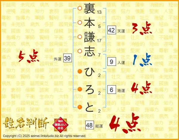 裏(13画)本(5画)謙(17画)志(7画) ひ(2画)ろ(2画)と(2画)
