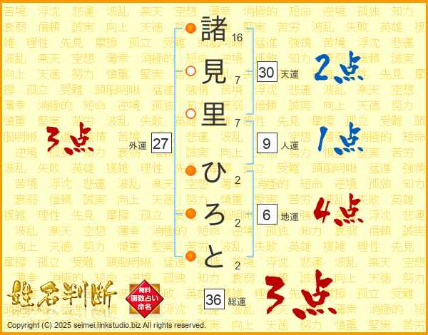 諸(16画)見(7画)里(7画) ひ(2画)ろ(2画)と(2画)