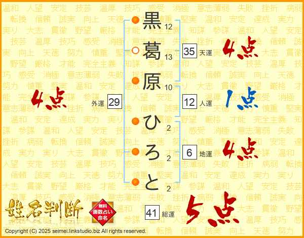 あなたの人生を表す1番重要な運勢です。生涯を通じて影響する総合運となり、主に50歳以降の晩年期に影響を及ぼします。苗字と名前の合計画数。