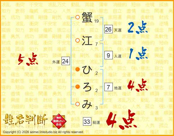 蟹(19画)江(7画) ひ(2画)ろ(2画)み(3画)