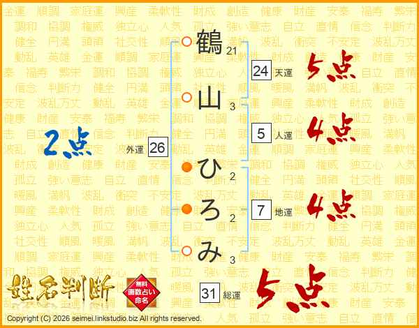 鶴(21画)山(3画) ひ(2画)ろ(2画)み(3画)