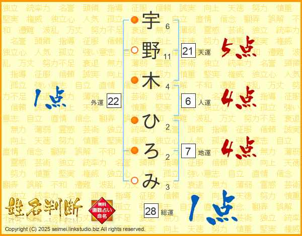 宇野木ひろみさんの総運は28画の1点!